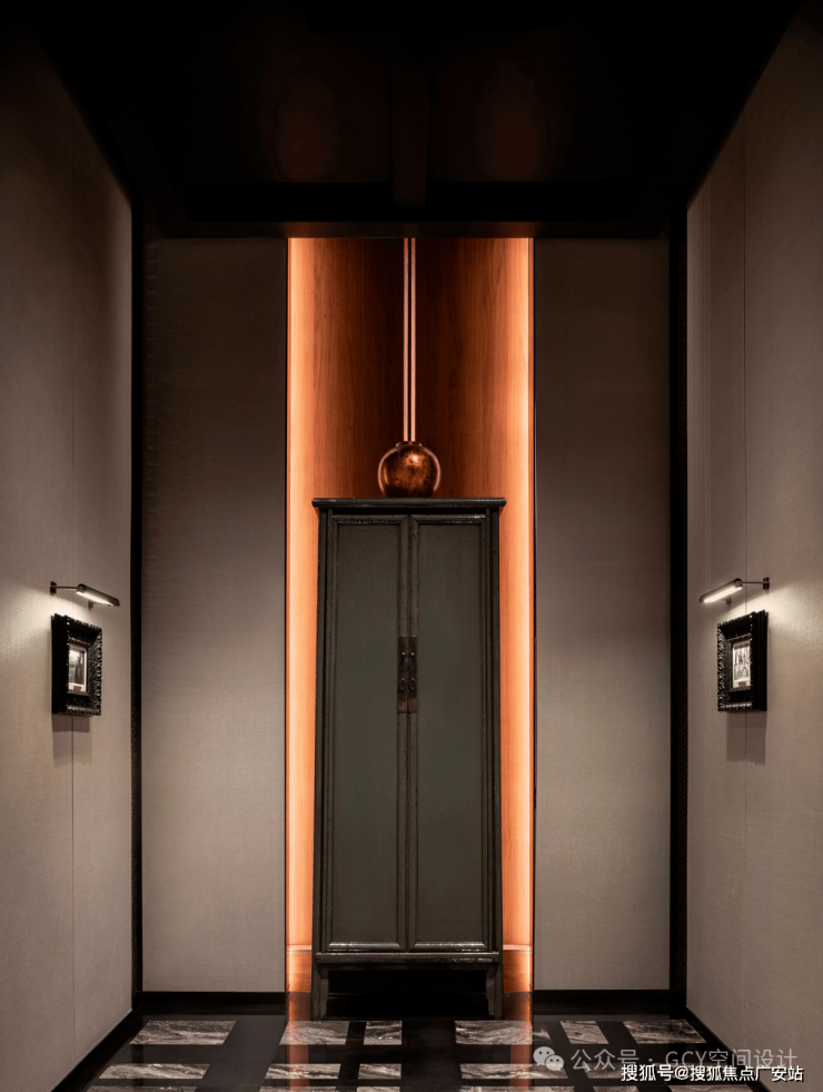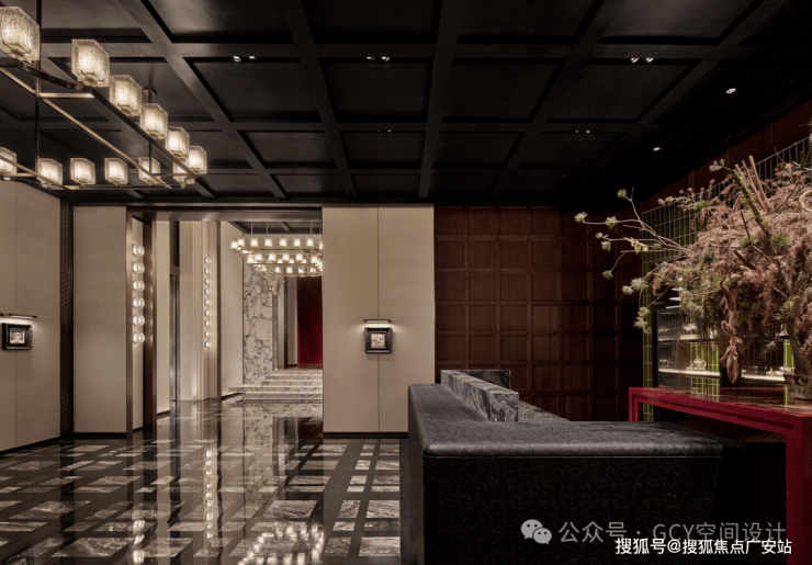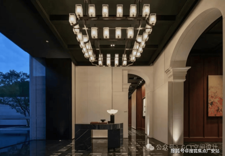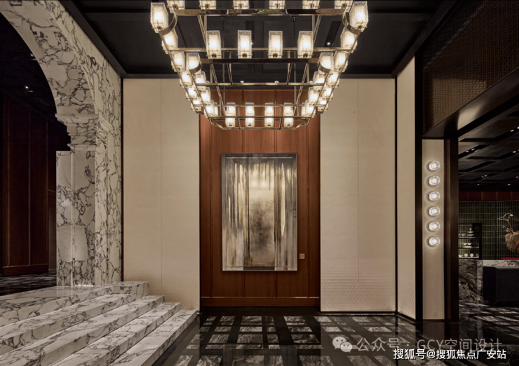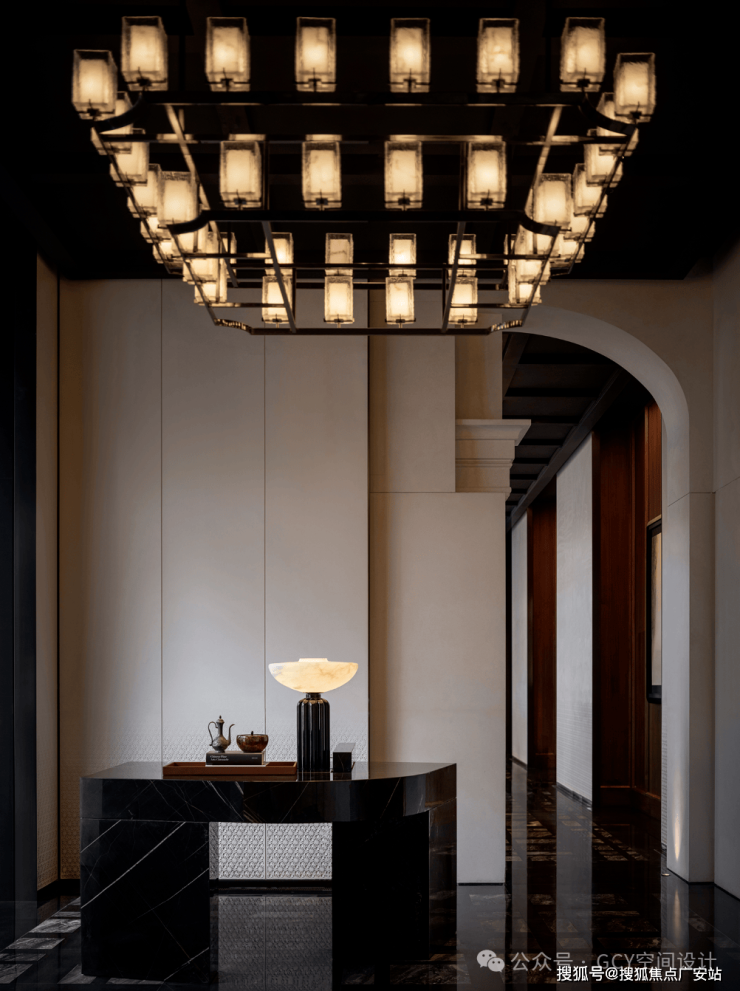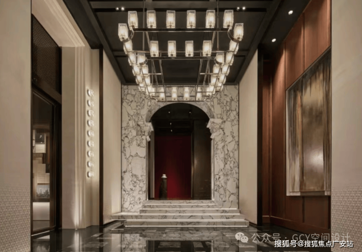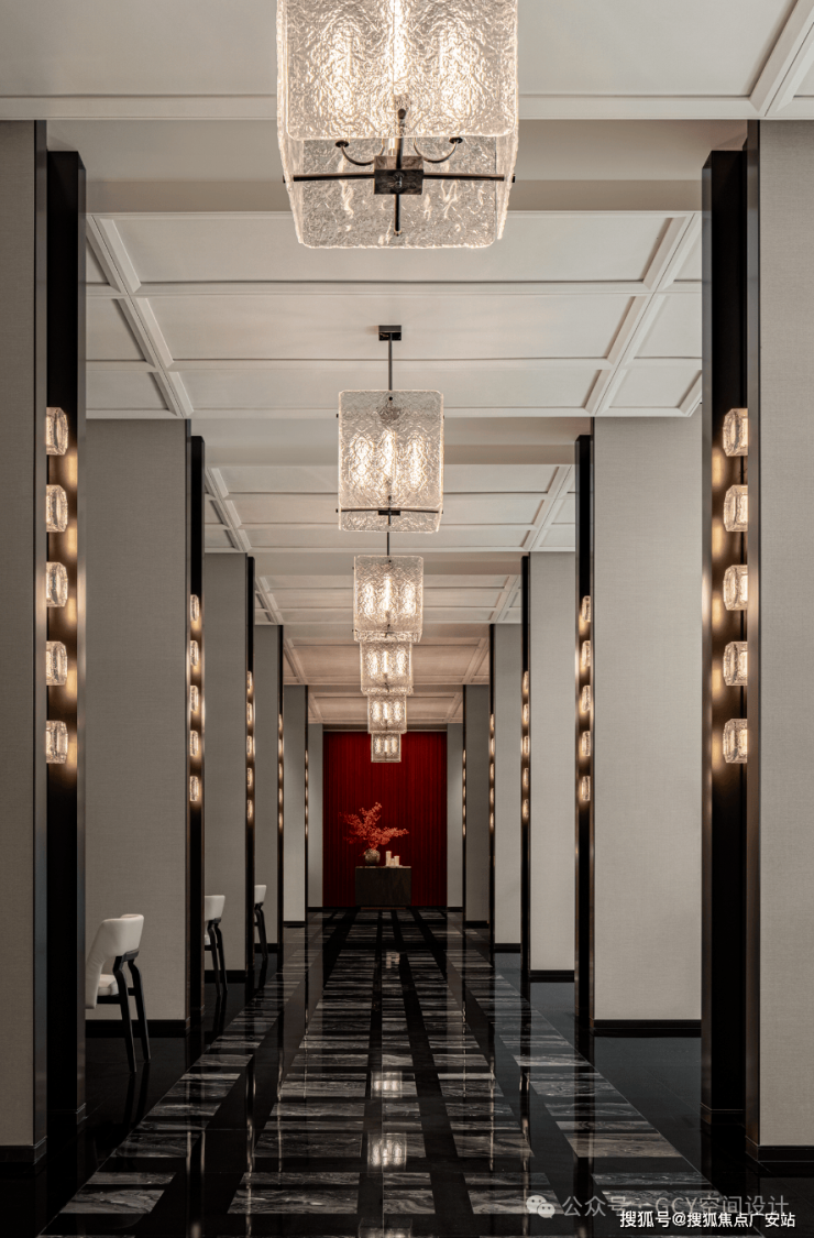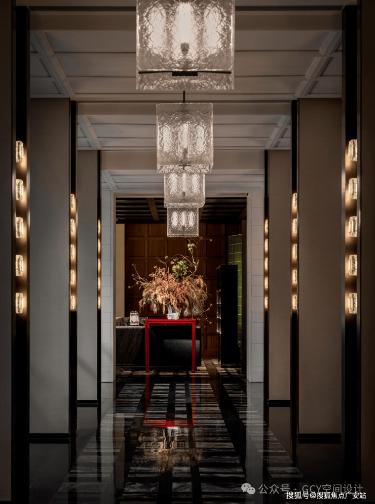 大理石拼花地面,纹理细腻且光泽感强,提升了空间的奢华质感。顶部悬挂的多层方形玻璃灯具,纹理精致且透光性好,灯光柔和,形成了富有层次的视觉焦点,兼具照明与艺术装饰功能。两侧墙面的嵌入式灯光装置,与主灯具呼应,增强了空间的纵深感与氛围感。走廊尽头的红色台面搭配艺术花艺,成为视觉终点,起到了空间引导与氛围营造的作用。