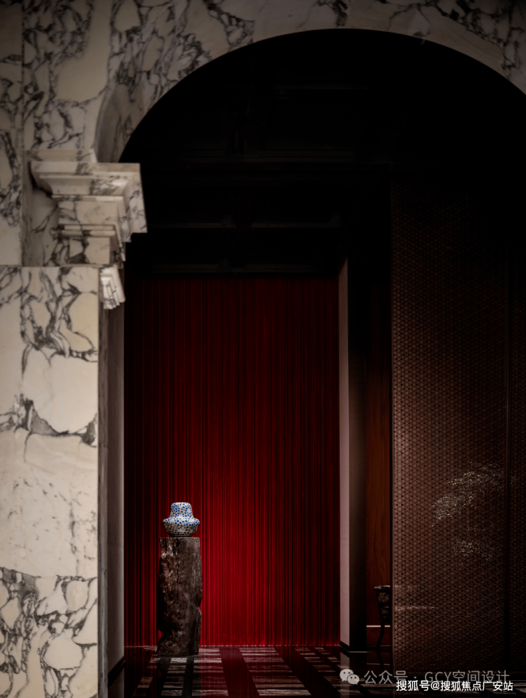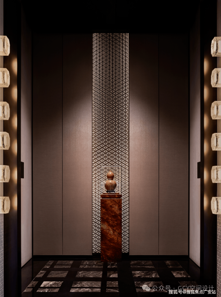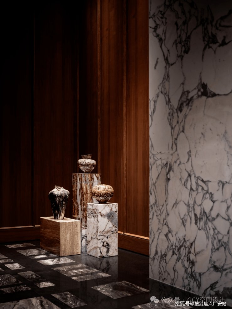 拙朴的陶器陈设置于纹理精致的理石方柱上,强化了空间中亦古亦今,既奢华又雅致的艺术氛围与文化内涵。