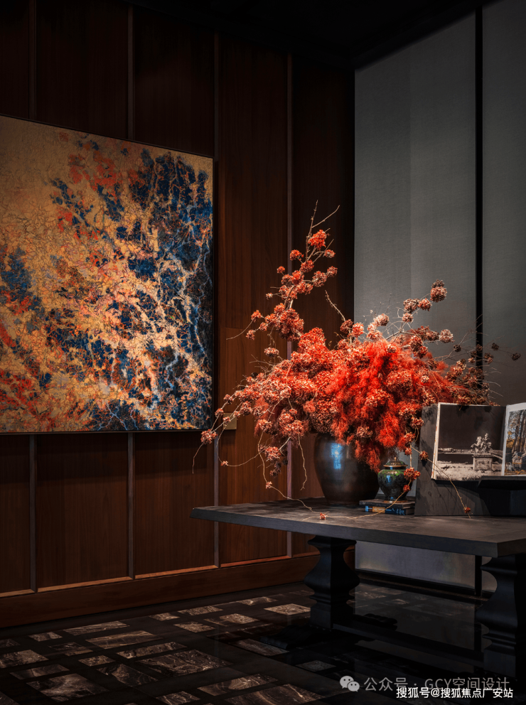 左侧墙面挂有一幅色彩丰富的抽象画,以蓝、橙、黄等色调构成,纹理细腻,提升空间的艺术氛围。灰色长桌上摆放着一盆以红色系为主的花艺,花材层次丰富,搭配深色花瓶,视觉冲击力强,起到了空间点缀和色彩调和的作用。整体风格偏向现代轻奢,深色木质墙面、大理石拼接地砖,搭配艺术画作和精致花艺,营造出典雅且富有格调的环境。