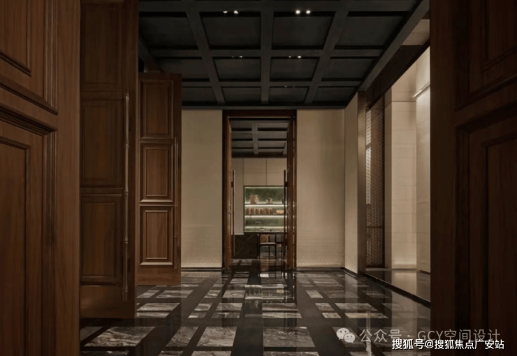 地面采用大理石拼花工艺,纹理精致且富有层次感,提升了空间的奢华感。复古棕色木质护墙板与现代简约米灰色墙板相融合,左侧的灯光装置和艺术挂画增添了空间的文化气息。