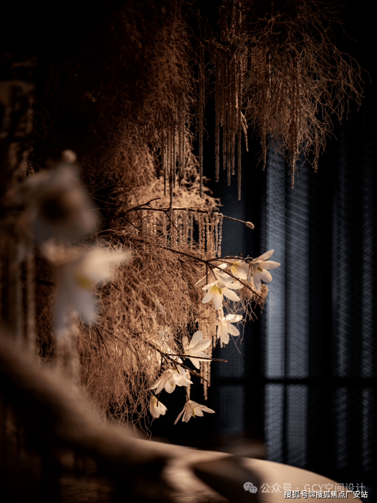 造型独特的环形灯具,由多个圆柱形灯罩组成,灯光柔和,营造出神秘且雅致的氛围,既是照明工具,也是空间的艺术装置。浅棕色为主的花艺搭配白色小花,层次丰富,风格偏向自然艺术,置于黑色花瓶中,与下方的白色台面相呼应,起到了视觉焦点的作用。