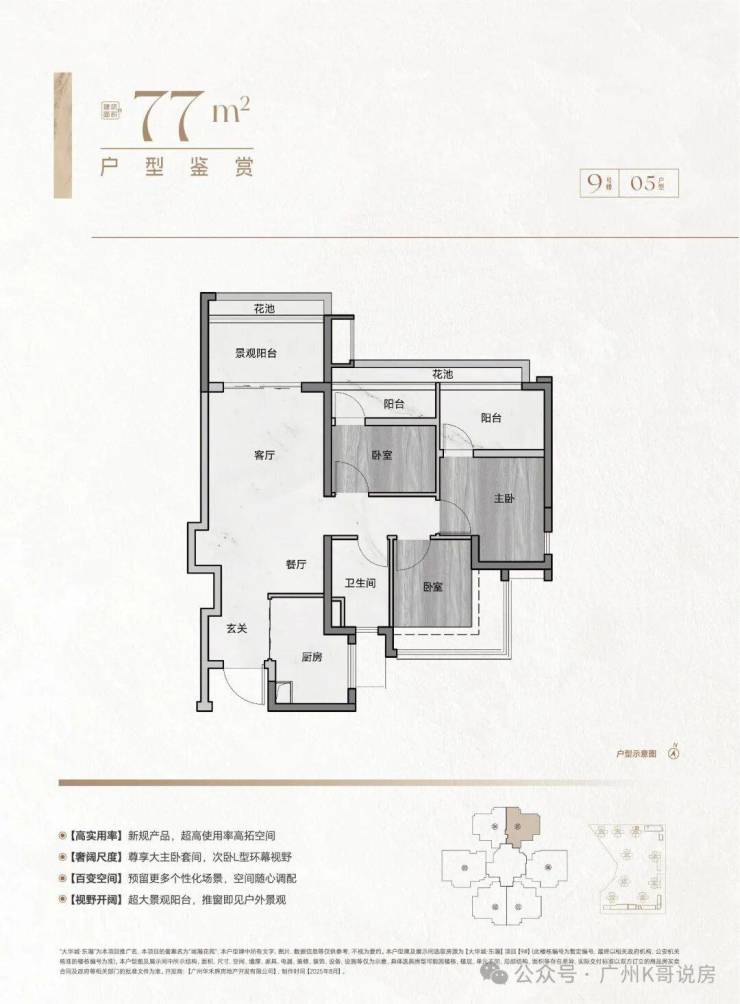 • 77㎡3房2卫(无敌视野景观):买77㎡,相当于旧规90平的使用感,小投入拿下够大的家;