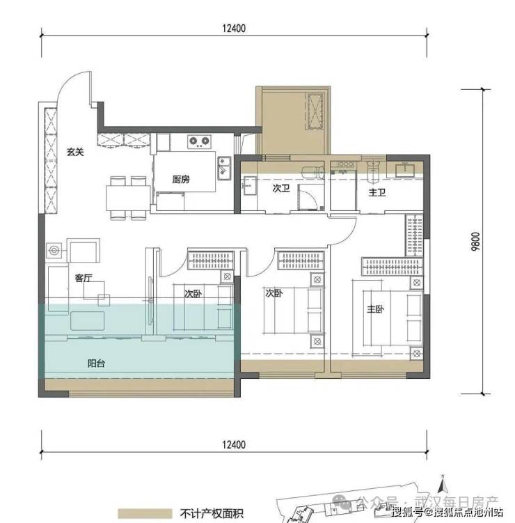 整体布局与100平户型大体一致,可以看做100平户型的放大版,但得房率更高,可达约100%,内部空间尺度更加舒适。