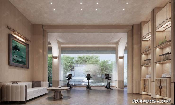 米白色调的纯净架空泛会所,超通透的无框玻璃幕墙设计,延伸空间,将景观串联。下沉庭院为延伸至负一层的会所打开了视野,引入天光,让健身活力得以释放。儿童区&书吧将以深色胡桃木的地面与墙面搭配米色系的天花,让空间显得明亮开阔又复古神秘。