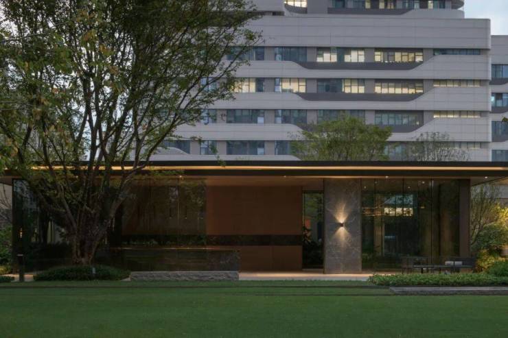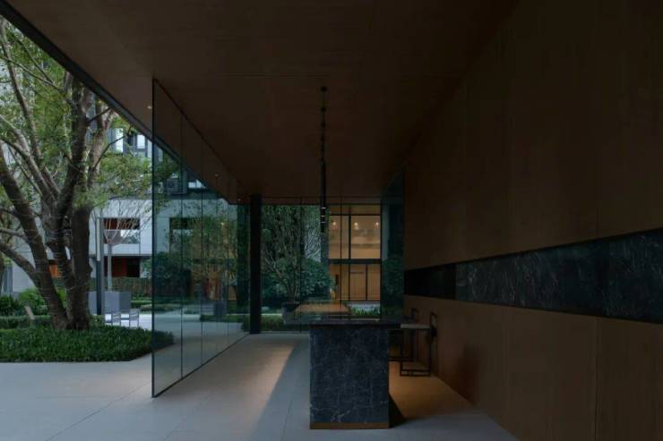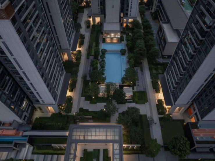第二进组团花园内设有充满度假氛围的泳池、休憩凉亭以及精致的艺术雕塑,这些元素不仅构成了归家途中的一道仪式感满满的风景线,也与度假花园的空间理念相呼应,形成了完善的配套设施。此外,艺术化的玻璃体块与外部的泳池相互映衬,使得整个空间在视觉上更为立体饱满,充分满足了三千多户居民的日常活动需求,营造出一个既实用又美观的公共休闲区域。