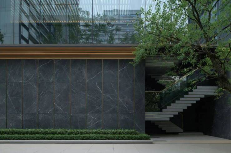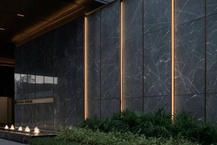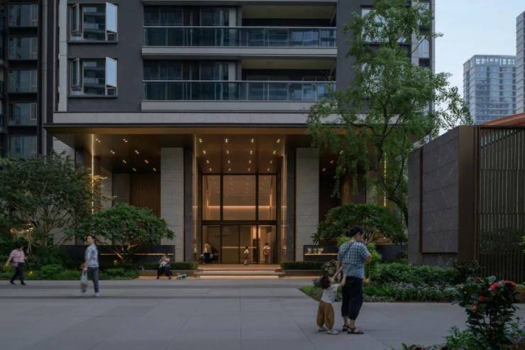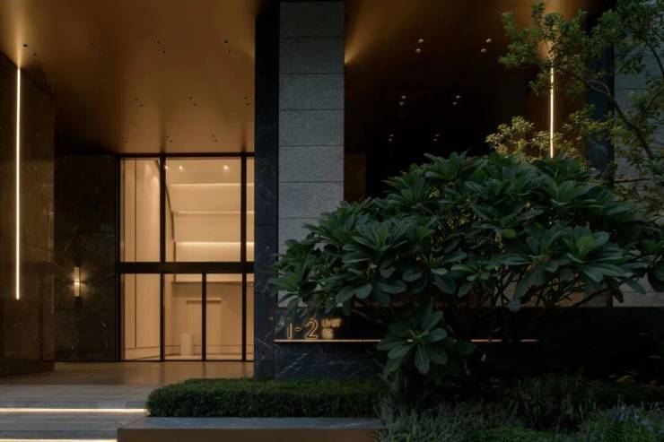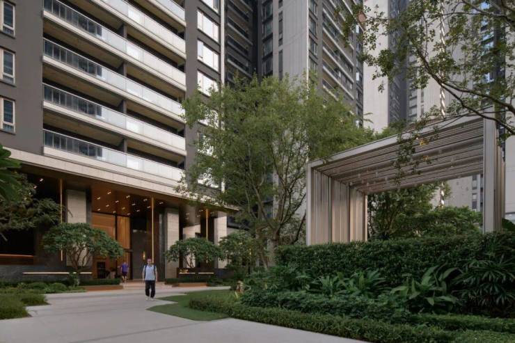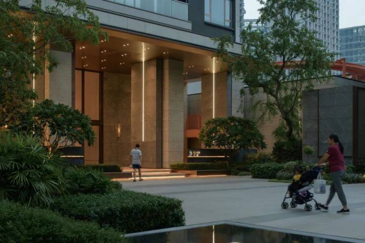 拥有一个高达8米的净空入户空间,专为追求舒适生活的老广与新广人群设计,旨在带来一股清新凉风的穿透感,确保空间尺度开阔、界面通透而不感压抑。此入户区域特别注重礼仪氛围的营造,两侧配置了精致细腻的景墙,与精心组团种植的绿植相映成趣,加之巧妙嵌套的种植花箱点缀其间,共同勾勒出一幅既庄重又不失雅致的入户景象,充分展现了空间的仪式感与精致韵味。