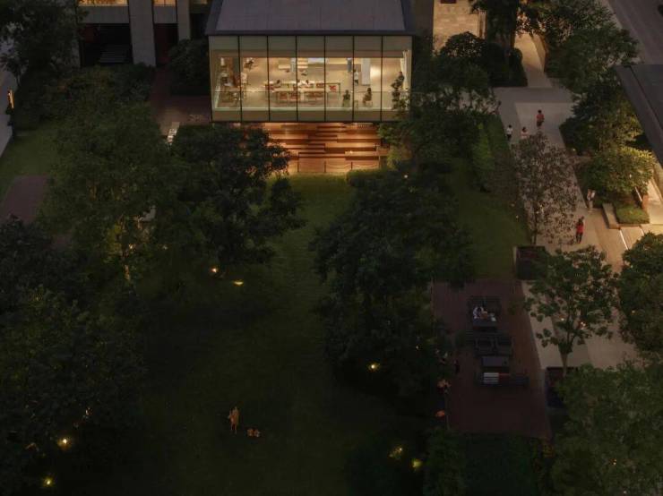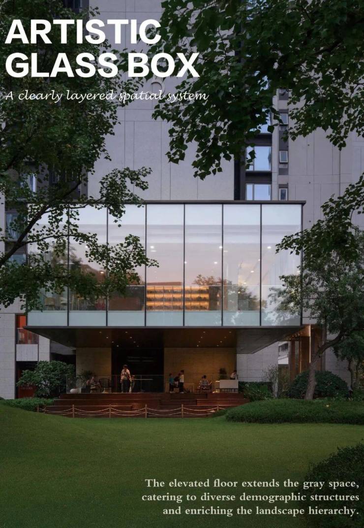 首个空间自入口起,引领访客步入一个以自然和谐、休闲林下为核心主题的花园空间。鉴于小区高楼林立、建筑密集,人均活动空间受限的现状,中心楼王架空层向外延展,以艺术化的玻璃体块作为亮点,构建了一个内外联动、层次分明的空间体系,与外界环境形成多维度的景致变换。架空层的内部主题与外围景观主题彼此呼应,营造微地形花园空间。此外,外部空间还配备了瞭望平台和花园看护区,进一步丰富了使用体验。