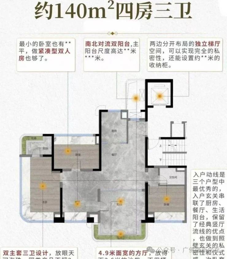 建面140平四房,可以实现全屋南北对流,南北双阳台,南向采光面约15.8米,还是双主套设计。