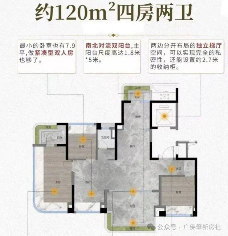建面120平四房,独立电梯厅,南北对流双阳台设计,约4.9米面宽方厅,主卧270°飘窗。