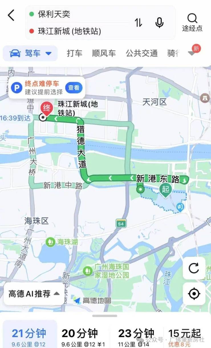 自驾或地铁通勤珠江新城:走新滘东路转猎德大道即可到达珠江新城,全程9.1公里耗时21分钟,打车15块,地铁5站耗时23分钟。