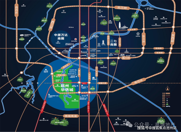 3.三横三纵交通立体网络,南三环、南四环两条环线快速通道和连接京广路横向大道,郑密路、嵩山路、大学路、京广路四条城市主干道。成就30分钟的城市生活圈。