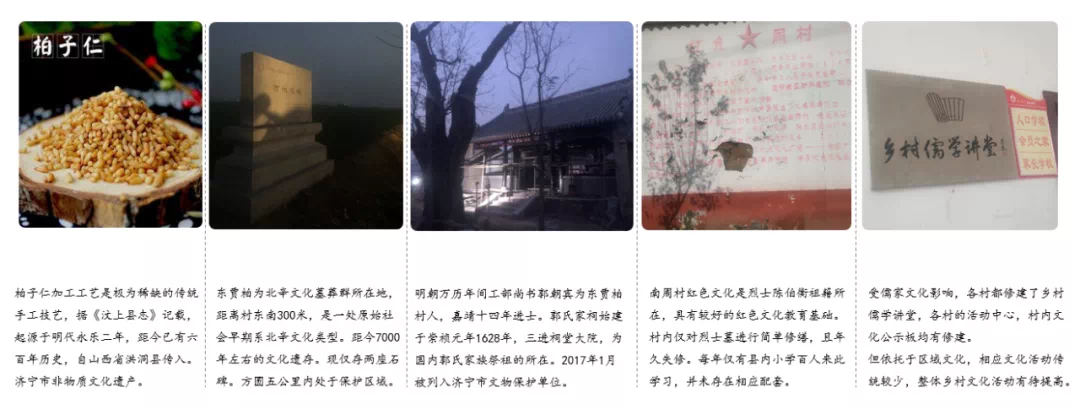 柏子仁加工工艺是极为稀缺的传统手工技艺,据《汶上县志》记载,起源于明代永乐二年,距今已有六百年历史,被列为济宁市非物质文化遗产。东贾柏为北辛文化墓葬群所在地,距离村东南300米,是一处原始社会早期系北辛文化类型。明朝万历年间工部尚书郭朝宾为东贾柏村人,嘉靖十四年进士。郭氏家祠始建于崇祯元年1628年,目前正在修复当中。南周村红色文化是烈士陈伯衡祖籍所在,具有较好的红色文化教育基础以及典型的乡村儒学文化。