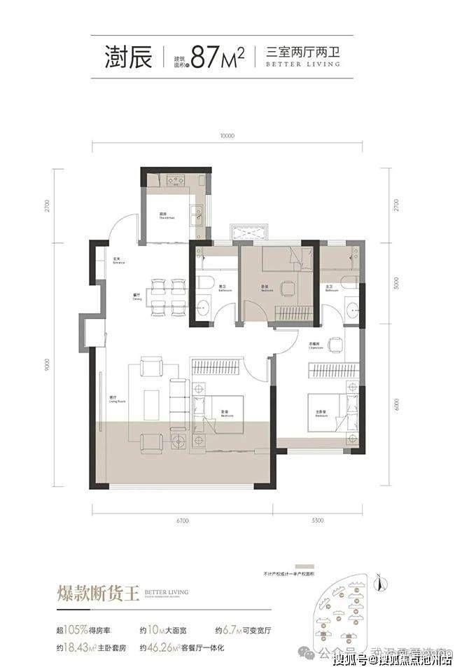 87平户型客厅宽度大概在3.4-3.6米(包括墙体),客厅处设置了凹槽可放冰箱。朝北次卧,整个次卧半赠送(把赠送做到了极致)