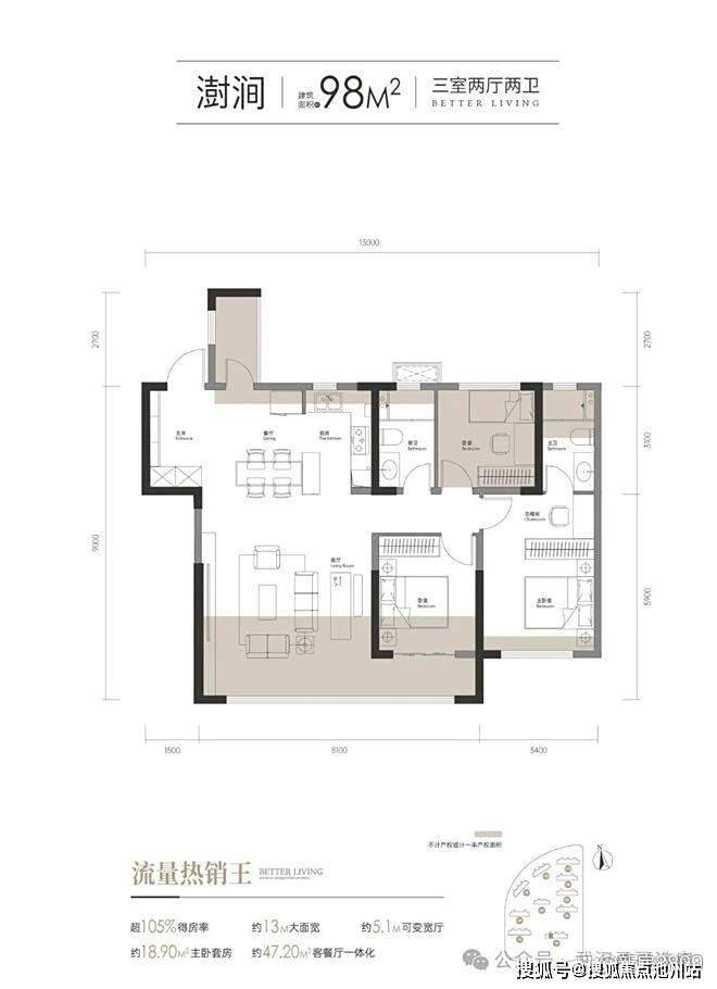 95平户型,客厅开间5.1米(含墙体),朝北次卧+厨房处的小阳台半赠送。