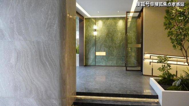 这个用水墨云灰大理石干挂、彩釉玻璃、定制海洋贝壳纹、金色流线嵌条来做出的长约60米度假酒店式归家大门,一开场气势非凡