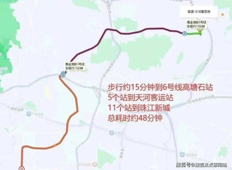 项目到地铁6号线高塘石站直线距离约700米(来源:百度地图测距),1站换乘直达珠江新城