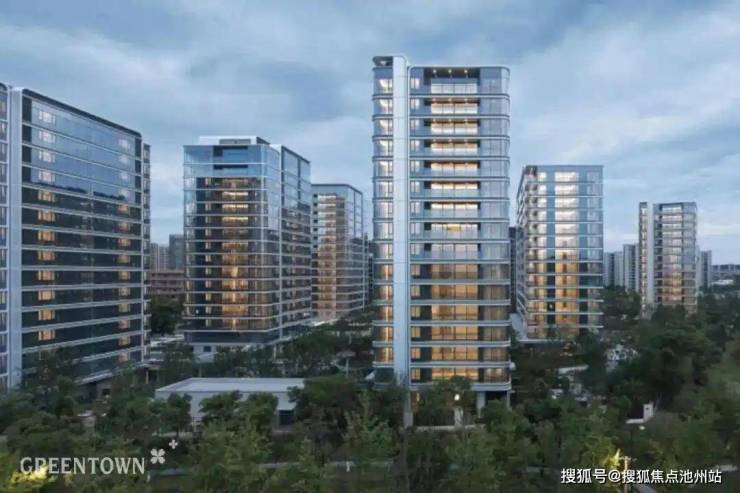 晓澜流幕:高层取钱塘江河破晓之色,让建筑犹如漂浮在水岸的盒子,通透渐隐。外立面采用灰白色色调搭配大面积玻璃,辅以金色装饰线条,与叠墅交相呼应。