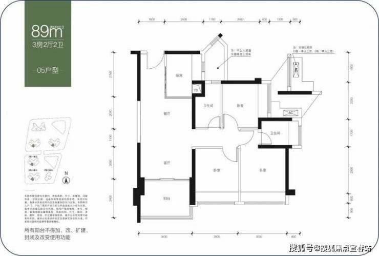 建面约89-90㎡,三房两卫,两者户型结构基本一致,都是动静分区结构,相比之下,89㎡户型动区面积小一点,90㎡是静区面积小一点,总的得房率差距很小,整体尺度比较舒适,经典实用型产品。