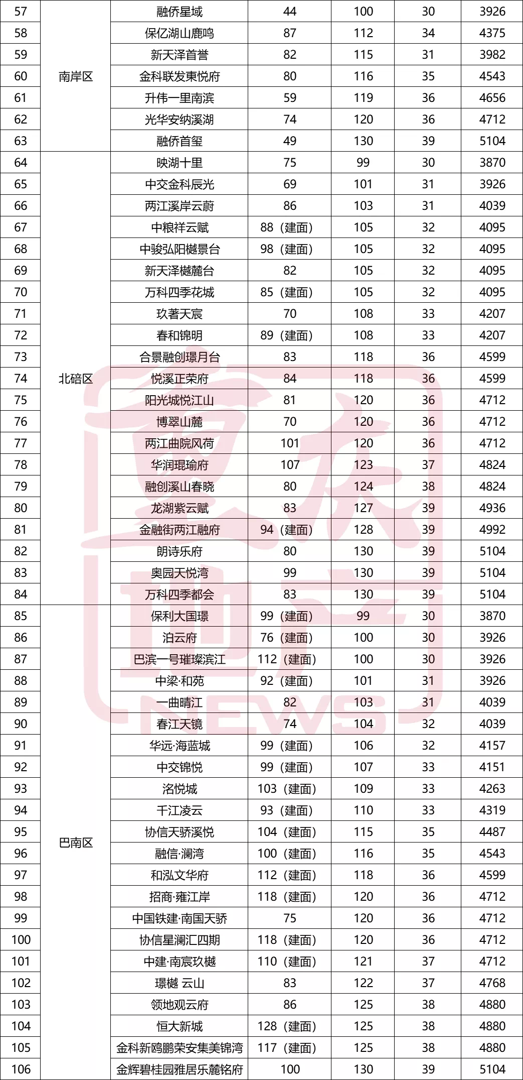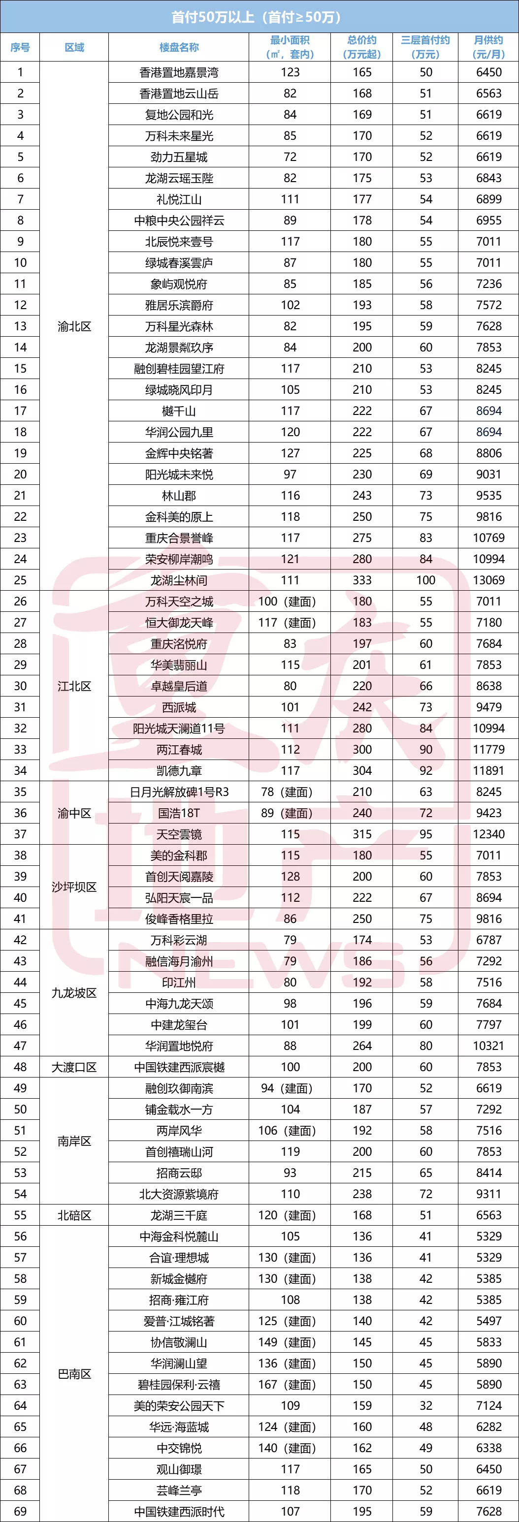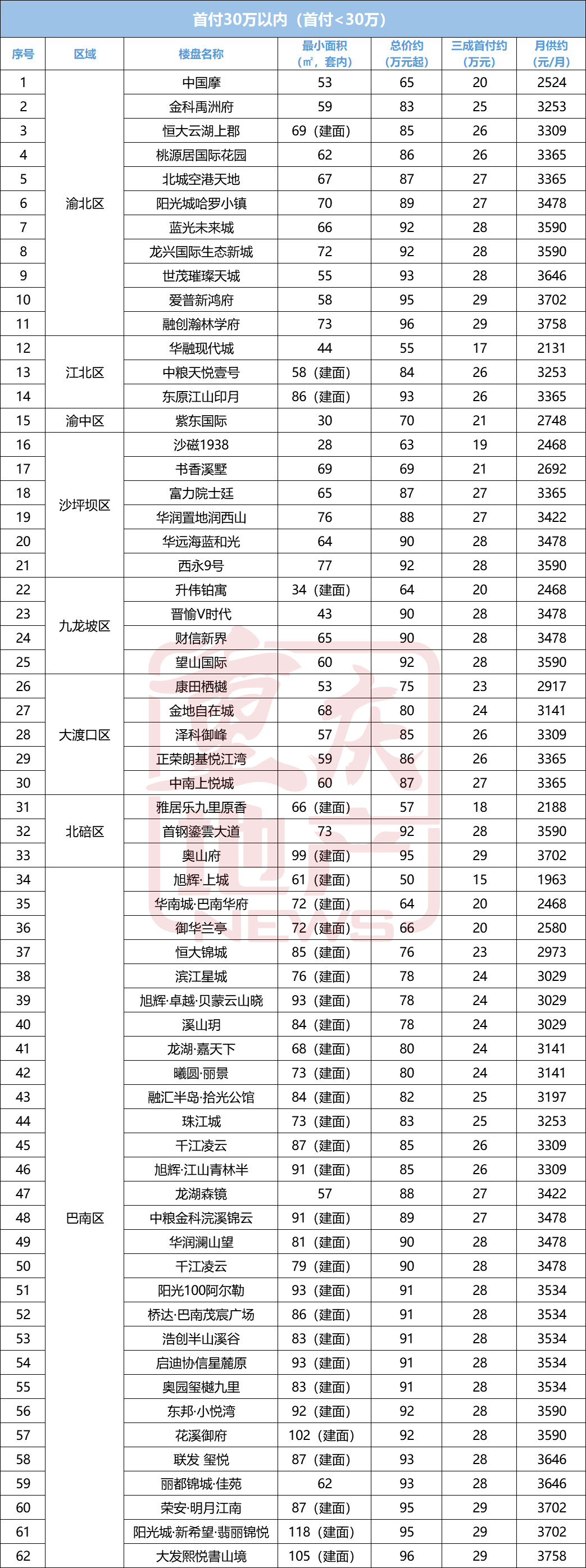 首付在30-40万中,月供在5000元以下的楼盘就多了,楼盘占比较大的是巴南区和大渡口区。
