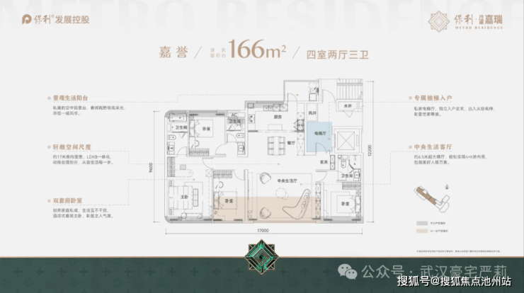 比如166户型,南向开间有17米,高层166平户型能做到这个尺度真的是相当惊人,要知道,二七滨江某盘169平的小高层都只做到了15米的开间,武昌滨江某豪宅188平的高层只做到了13.95米的南向开间。