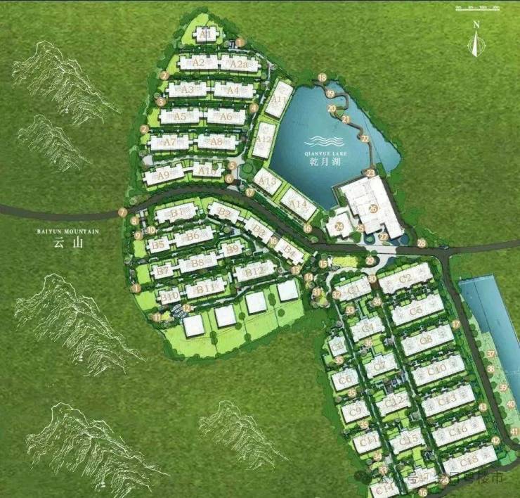 分为ABC三个住宅组团分期开发,其中A区为41套联排别墅和15套临湖别墅,B区为37套联排别墅,C区以叠墅为主少量平墅产品,共规划269户。