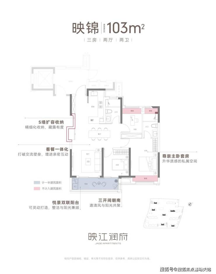 项目建面约103㎡中间套几乎保留了上述户型所有惊艳亮点,包括客餐一体化、双联阳台+多飘窗附赠、三开间朝南、套房主卧等。