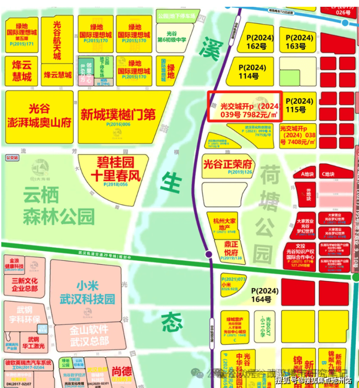 P(2024)039号地块是2024年6月28日由武汉光交城市开发有限公司竞得,成交价为83490万元,楼面价为7981.84元/㎡。地块位于和风街,芷泉路交汇处,属于纯居住用地,总计地块面积为60775.82㎡,计容建面10.46万m²,容积率1.72。