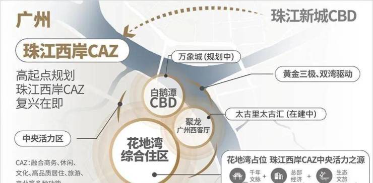 此外花地湾片区基本都是由万科统一开发,汇合白鹅潭-花地湾-聚龙组团的板块张力,白鹅潭核心区、聚龙组团、花地湾组团,于半径约2KM内构建珠江西岸CAZ黄金三极。