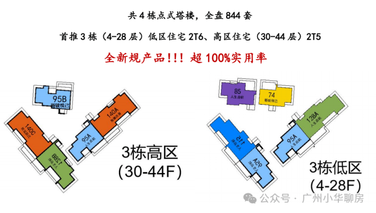 而30-44层,则为2梯5户,户型面积则包括:95㎡、128㎡和140㎡等三种户型。
