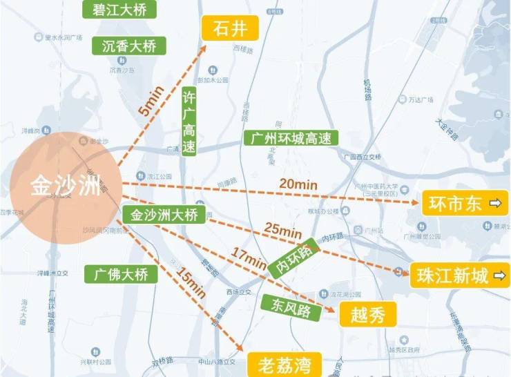 金沙洲的区位,其实都还行,横跨广州白云区和佛山南海区,临近荔湾,和广州的主城区相隔不远,尤其是广钢新城、白鹅潭、白云新城这些,对于不少人来看,这样的距离,是符合通勤距离的。