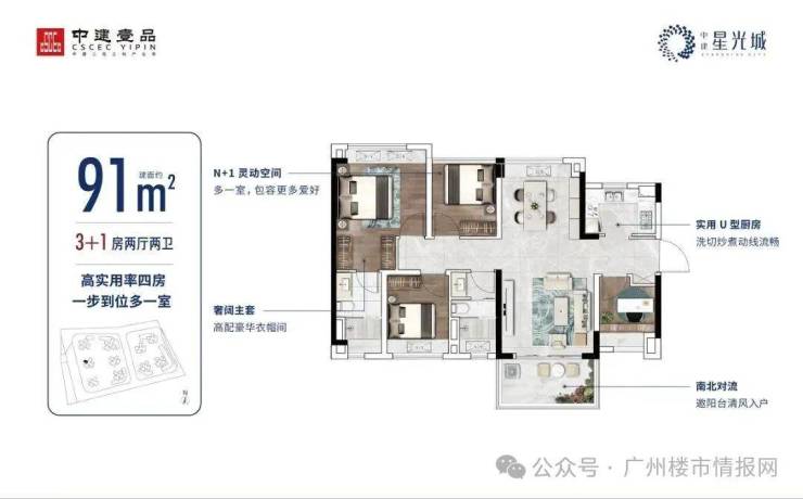 91㎡南北通透四房,视野开阔,户型方正,实用率超100%.