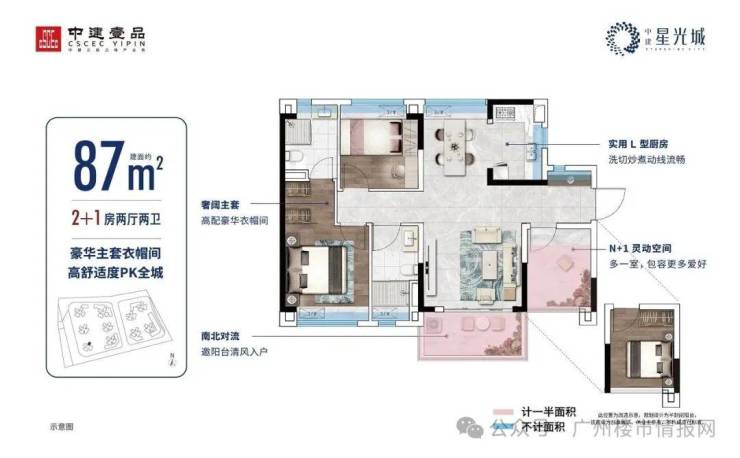 中建星光城小区总体设计南低北高,采光通风更好,而且还贴心的设计成蝶形,保证户户朝南。