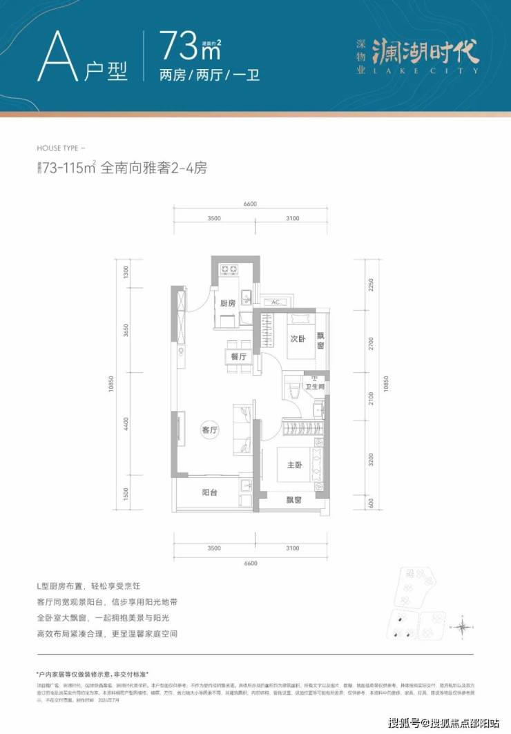 73㎡的2房2厅1卫,设计的是竖厅格局,客厅3.5米开间,LDKB一体化设计,2个卧室分别做到了3.1米/2.7米的宽度,L型厨房,卫生间干湿分离,得房率77-78%(不含赠送),阳台都是西南朝向。