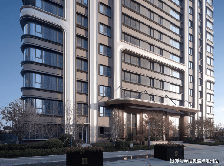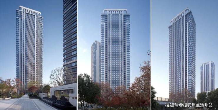 立面竖向线条强调出超高层豪宅的立面挺拔,弧形与斜面结合的多层次线条呼应了降水的柔美,体现出不一样的调性和品质。通过视觉多层级的材料控制,保证主体视觉效果的前提下,实现了“主框挺,大面省”的降本增效目标。