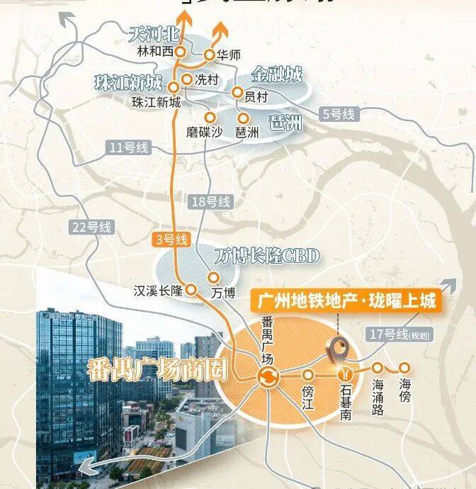 距离石基南站约500米,2站番禺广场;通过3号线无需换乘直达珠江新城,无缝对接18/22号线,实现3站万博CBD,4站广州南、琶洲CBD,5站珠江新城,半小时连接市中心,一小时畅行湾区。