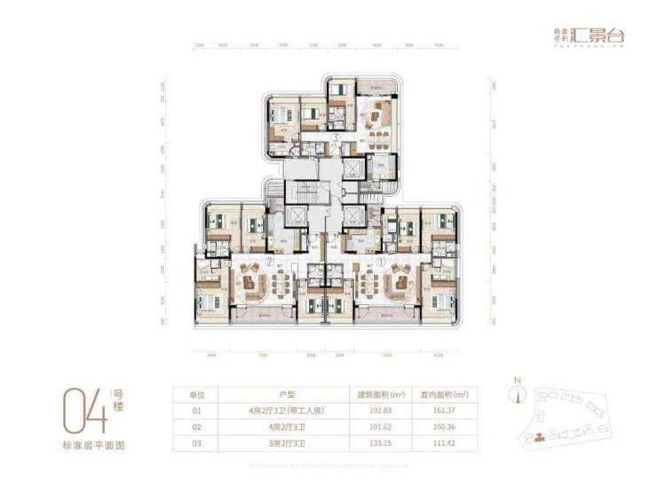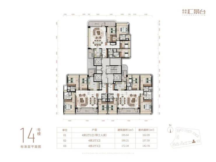 项目由14栋12层小高层组成,产品涵盖123-352㎡三至五房,共8类户型,户型实用率约82-84%