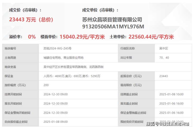东吴序,即苏地2024-WG-Z45号地块,位于吴中经开区长桥街道宝带西路南侧、龙西路西侧,1月8日由吴中建设以底价23443万元竞得,成交楼面价15040元/㎡。