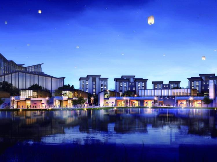 商业配套:双五星级酒店、环湖风情商街(奢侈品工厂店、非遗文创商街、温泉会议中心、餐饮及酒吧等)、永辉超市、当代商场