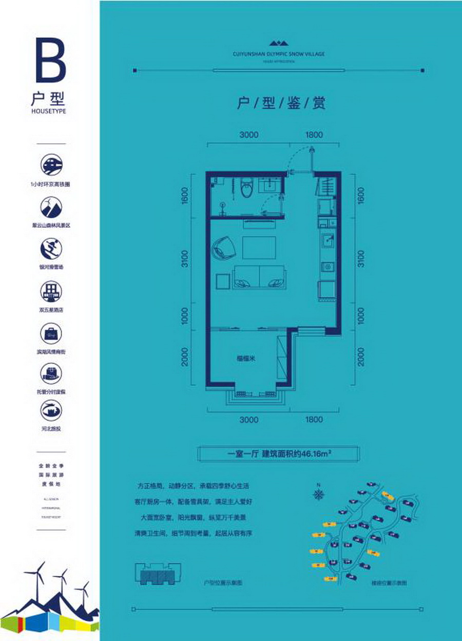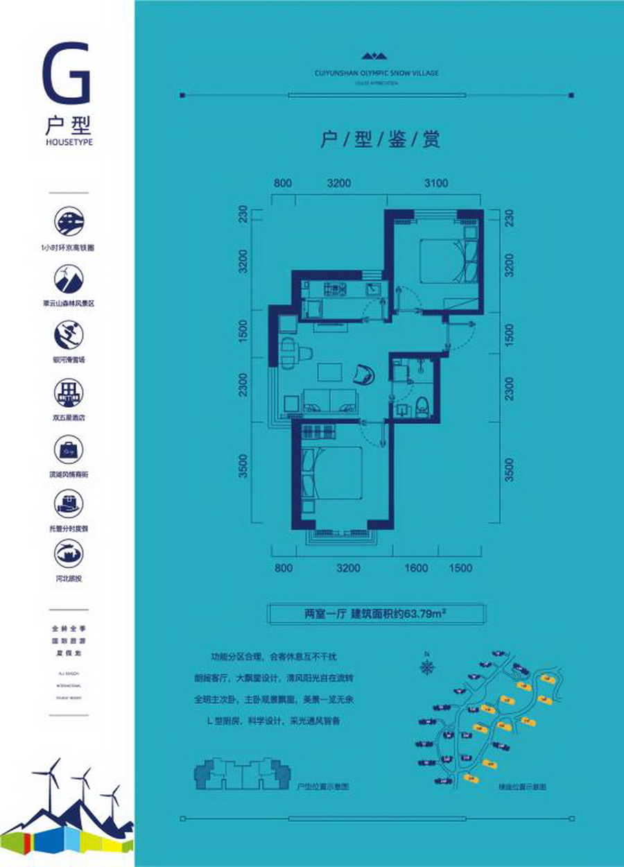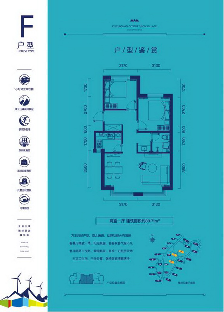 翠云山奥雪小镇紧邻张承高速崇礼北口,京张高铁城市首站端立项目内。作为冬奥配套项目,小镇依托京西排名前列雾山78平方公里翠云山而建,由实力国企河北旅投精工匠筑,是崇礼少有景区内70年大产权项目,坐享翠云山森林风景区、银河滑雪场成熟配套,双五星级度假酒店、华北排名前列奢侈品工厂店、温泉会议中心、非遗文创商街等环湖配套将逐步开放运营,是集滑雪运动、避暑养生、家庭度假、休闲娱乐于一体的全季全家庭度假乐园。以度假生活体验为核心,打造滑雪公寓、康养住宅、度假酒店三大度假产品体系。