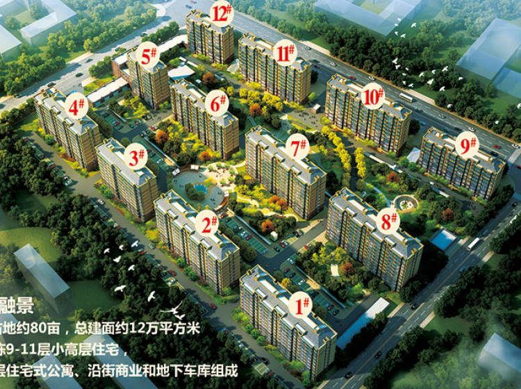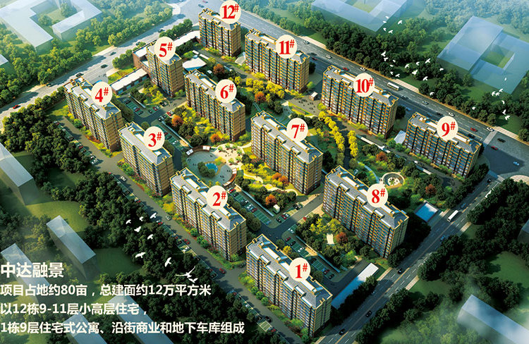 项目占地80亩,以12栋9-11层小高层住宅,1栋9层住宅式公寓,、沿街商业和地下车库组成