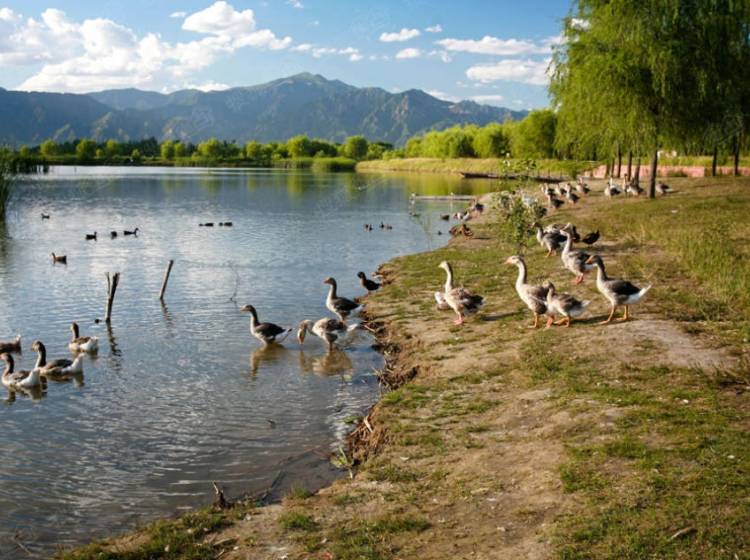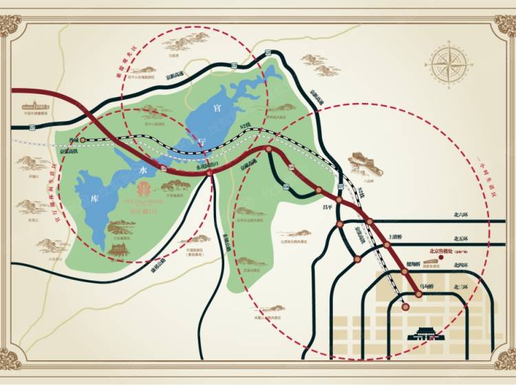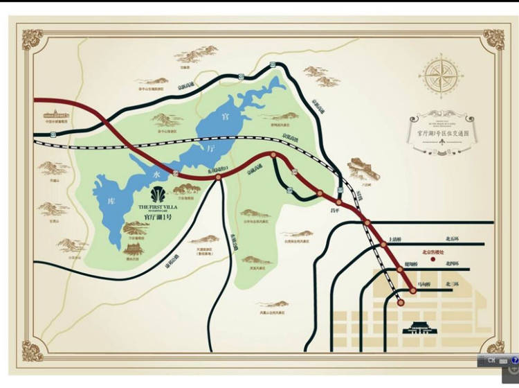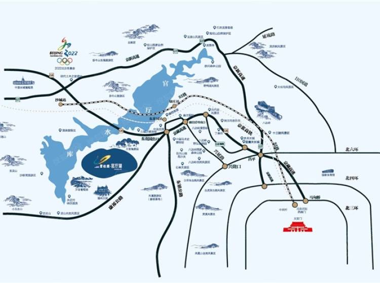 周边景观(自然景观,公园绿化):烟波浩渺的官厅湖,八达岭长城、原生态的八达岭国家森林公园、古崖居、天漠风光、龙庆峡、康西草原、野鸭湖湿地生态园、永定河漂流等众多旅游度假景点。