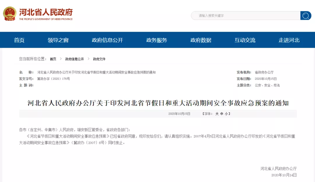 近日,省政府办公厅网站发布《河北省人民政府办公厅关于印发河北省节假日和重大活动期间安全事故应急预案的通知》,详情如下↓↓↓