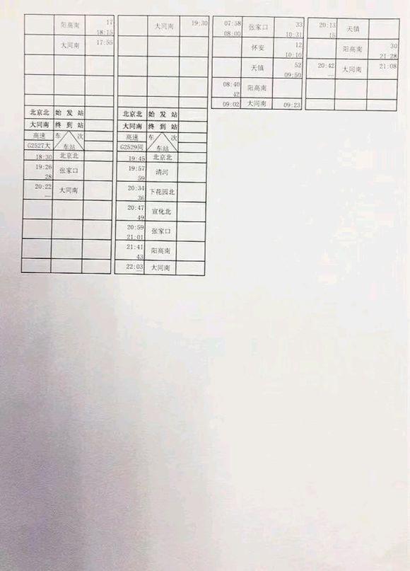 ▲大同至北京的高铁列车时刻表