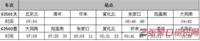 此外,百度贴吧有网友发布一张大同至北京的高铁列车时刻表,表中显示,乘坐高铁从北京北到张家口站较快约需56分钟,从大同南到张家口站较快约需55分钟。