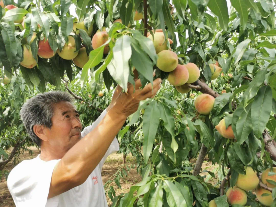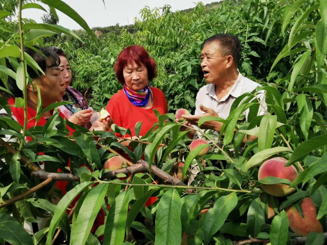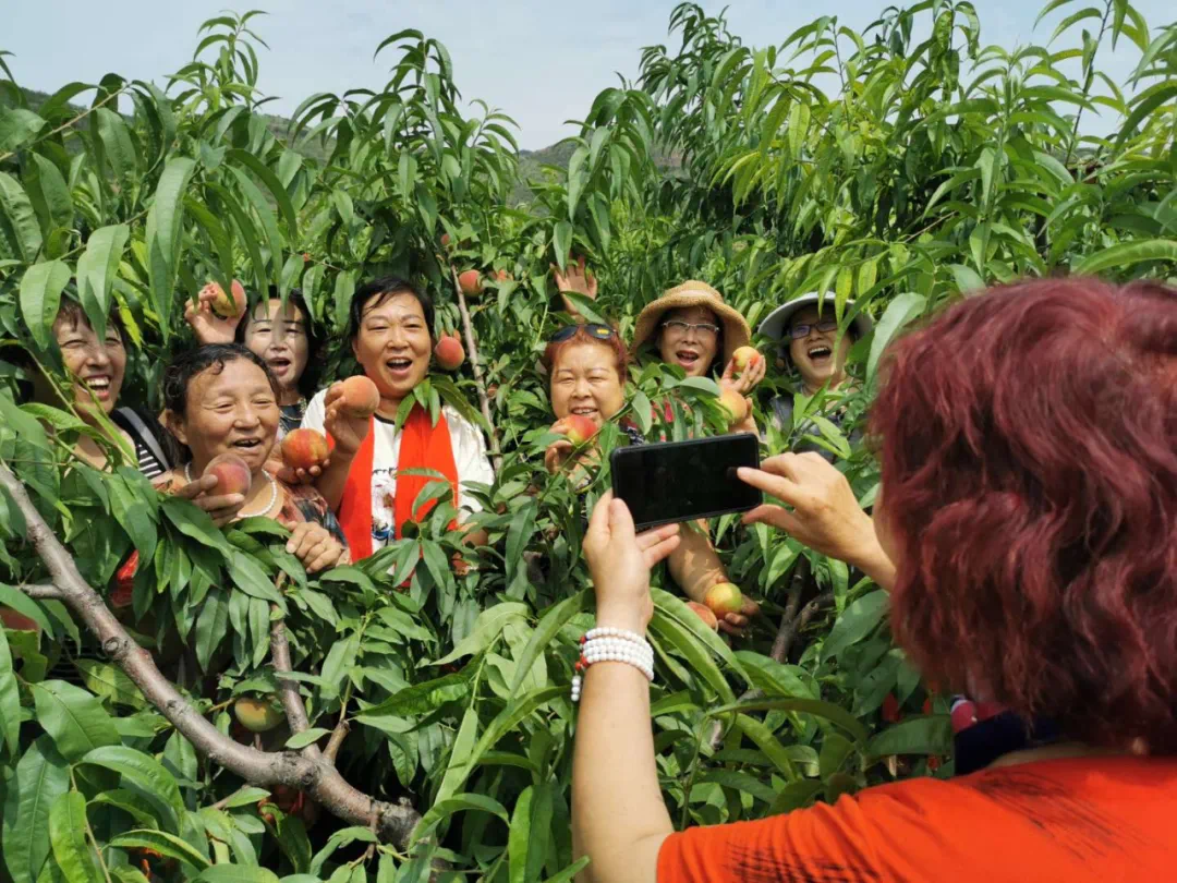 ▲游客在桃林里展示采摘的桃子1982年4月,原市人大代表、王家寨村老书记武贵昌从唐山林科院引进树苗开启了全村的产业兴农之路,三十多年来,历任村干部带领村民不断扩大种植规模,实现了逐年稳步增收。
