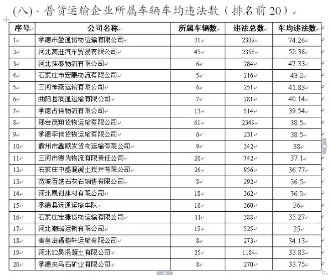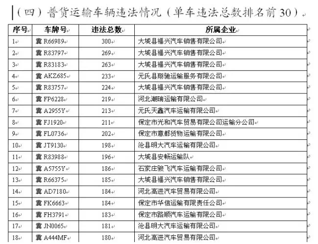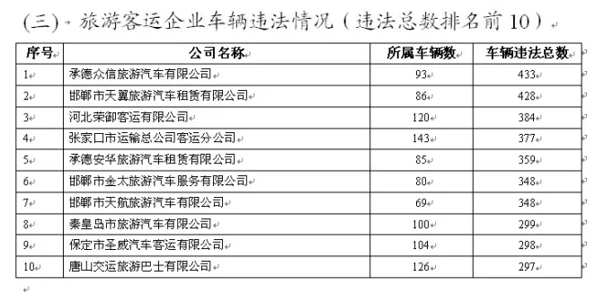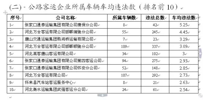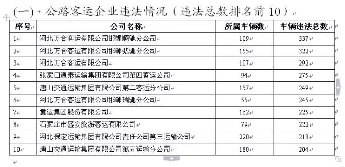 日前,河北省公安厅交通管理局对全省道路运输企业及其所属车辆2019年交通违法情况进行了梳理,通报了公路客运、旅游客运、危险品运输、货运交通违法“大户”,提醒这些运输企业和车辆驾驶人严格遵守道路交通安全法,拒绝危险驾驶行为,抵制交通违法。