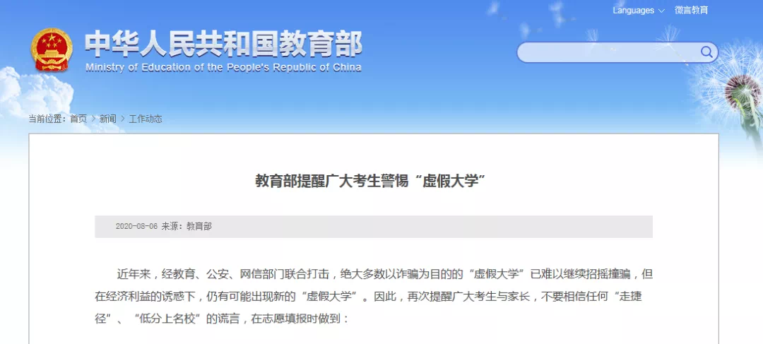 近年来,经教育、公安、网信部门联合打击,绝大多数以诈骗为目的的“虚假大学”已难以继续招摇撞骗,但在经济利益的诱惑下,仍有可能出现新的“虚假大学”。因此,再次提醒广大考生与家长,不要相信任何“走捷径”、“低分上名校”的谎言,在志愿填报时做到:查官网官微:2020年具有高考招生资格的全国高等学校名单共3005所均已在教育部门户网站和官方微信公众号“微言教育”发布,考生和家长可以通过登录官网或在官微“微言教育”“高校名单”栏目进行查询核实。查代码:每一所经教育部备案的高校都有高校报考代码与专业代码,在各省(区、市)填报志愿系统中均可查询。虚假大学因未有办学资质而无招生代码,查不到代码的学校都是“虚假大学”。看分数:高考成绩是高校录取的重要依据。任何声称,可以不看分数,交钱即上的学校,都是在招摇撞骗。平常心:高考无捷径,只有放平心态,理性认识,不相信所谓的高考捷径,那么“虚假大学”也就无所遁形。