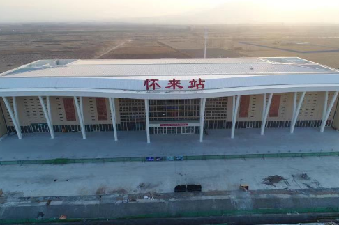 怀来站站房建筑面积约1万平方米,站房造型典雅。取意鸡鸣驿古城墙香槟色的外幕墙,正面10根Y形立柱,造型质朴,似酒杯又似葡萄藤,更象征百年京张的“人”字形铁路。
