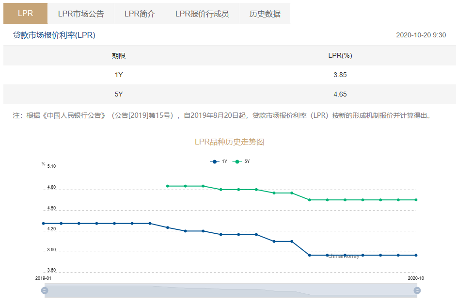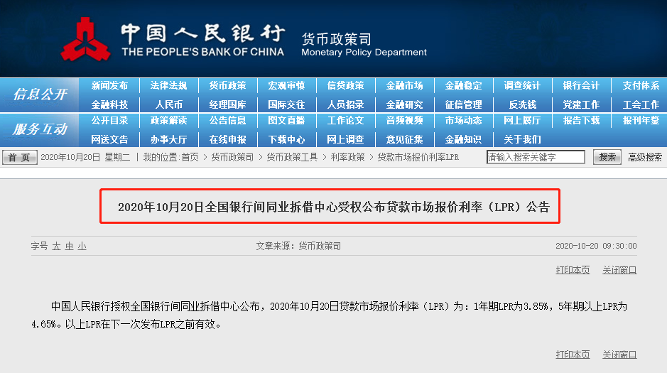今天上午,中国人民银行公布了较新贷款市场报价利率(LPR)公告。据显示,一年期LPR为3.85%;五年期以上LPR为4.65%。