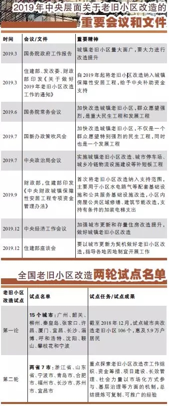 早在2015年12月召开的中央城市工作会议上,习近平总书记发表重要讲话就提到要“加快老旧小区改造”。2016年2月,《中共中央国务院关于进一步加强城市规划建设管理工作的若干意见》提出,要“有序推进老旧住宅小区综合整治、危房和非成套住房改造”。2017年12月,住建部启动了广州、厦门、长沙、呼和浩特、沈阳、宁波等15个城市的老旧小区改造试点,并形成了一批可复制可推广的经验。进入2019 年,老旧小区改造政策热度持续提升。